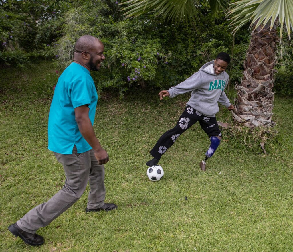Among the first patients to receive a prosthesis is Kudakwashe, a young man whose dribbling skills and speed left Dumi feeling like an amateur soccer player after fitting him with his prosthesis. “My mother used to tell me not to play soccer with my old prosthesis because she feared it would break, but this new prosthesis is strong, and the manager (Dumi) said I can go ahead and play soccer with it,” smiles Kudakwashe.